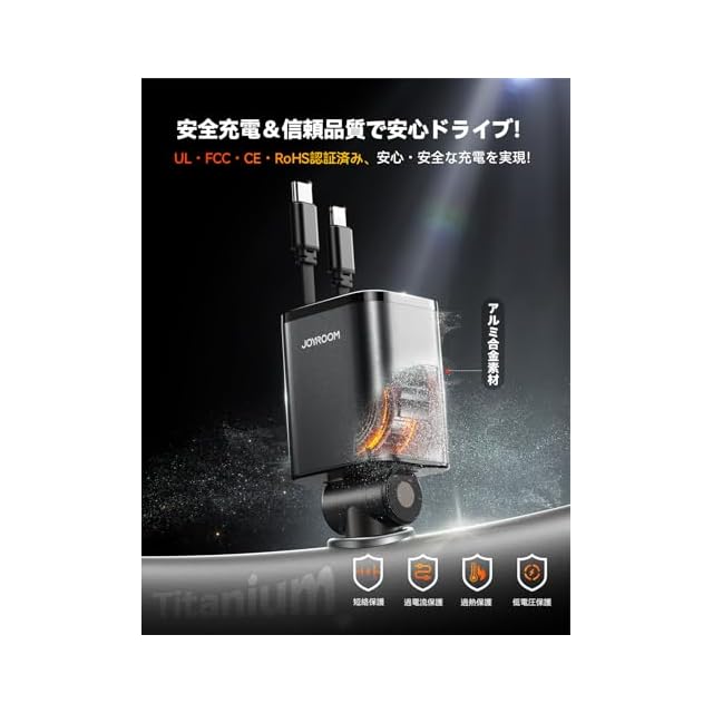 【高耐久&多重保護設計|安全性も抜群】 アルミ合金&難燃性ABS素材を採用し、車内の過酷な環境に対応した設計します。短絡保護、過熱保護、過電圧保護、過充電保護など多重保護機能を搭載し、長時間の使用でも安心します。巻き取り式充電ケーブルは10,000回以上の伸縮テストをクリアし、高耐久で長持ちします。カーチャージャー タイプcをお探しの方にもおすすめのモデルです。