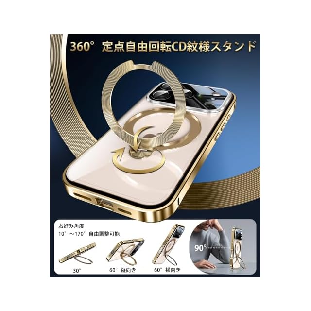 商品名:iPhone 17 Pro 用 ケース 両面保護 MagSafe対応 光沢CD紋様リング 360°定点回転スタンド 自動ポップアップロック付き カメラレンズフル保護 いphone 17 pro 用 Gunwon スマホケース アルミ合金バンパー 9H一体型保護フィルム 背面クリア 全面保護 フルカバー ワイヤレス充電 縦横両対応 アイフォン 17 プロ 用 携帯ケース「ゴールド」