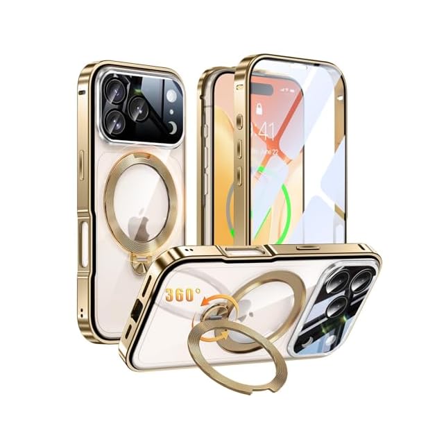 iPhone 17 Pro 用 ケース 両面保護 MagSafe対応 光沢CD紋様リング 360°定点回転スタンド 自動ポップアップロック付き カメラレンズフル保護 いphone 17 pro 用 Gunwon スマホケース アルミ合金バンパー 9H一体型保護フィルム 背面クリア 全面保護 フルカバー ワイヤレス充電 縦横両対応 アイフォン 17 プロ 用 携帯ケース「ゴールド」