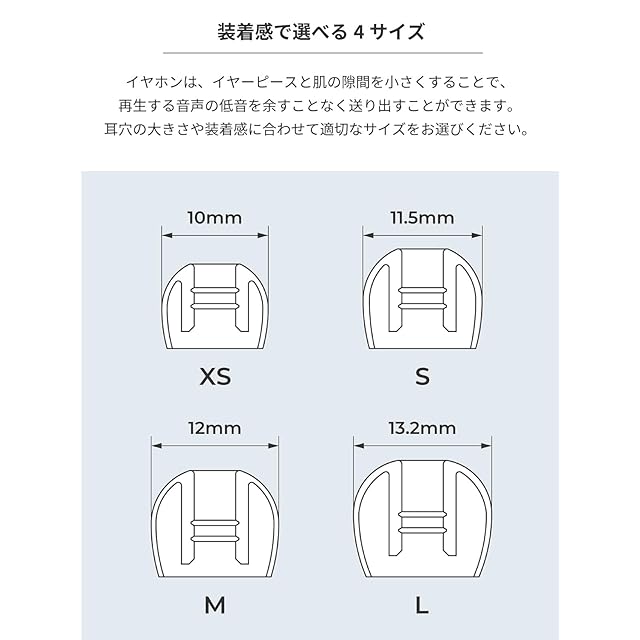【製品サイズについて】耳の形やサイズによっては装着できない場合や外れやすい場合があります。TWSイヤホンではサイズによってケースが閉まらないこともあります。初めてご使用の際は必ずサイズをご確認いただくか、全サイズ入りセットをご購入いただくと安心です。