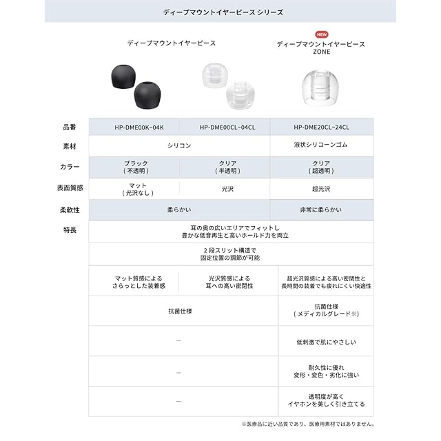 優れた装着感と豊かな低音再生を実現するイヤーピース / 耳の奥の広いエリアでフィットする独自形状 / 清潔で安心の抗菌仕様