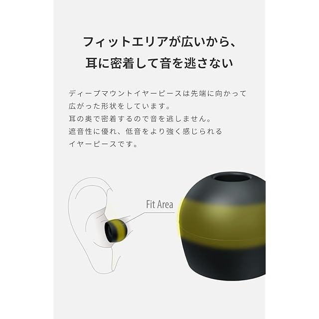 【イヤホンの装着性を高める独自形状】一般的なイヤーピースと比較して耳のより奥の広いエリアでフィットする独自形状により密閉性が向上。豊かな低音再生とイヤホンの落下防止を両立する極めて安定した装着感を実現します。抗菌仕様のため永く清潔にご使用いただけます。