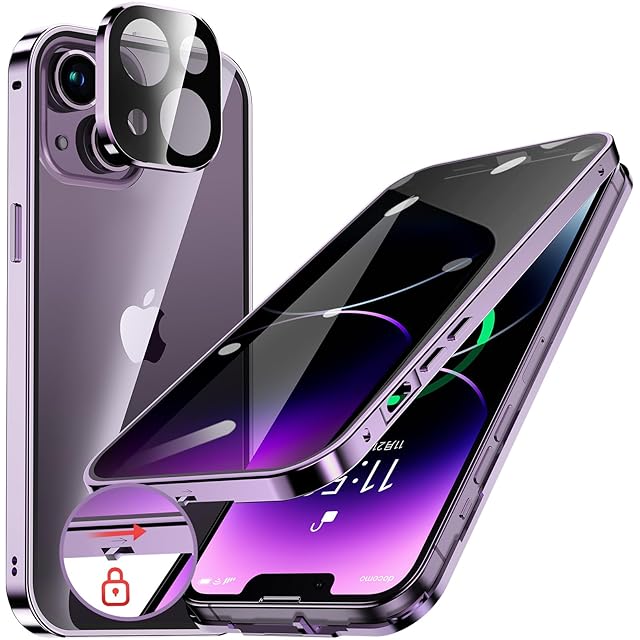 HGUTREY【覗き見防止・自動ポップアップボタン】 iPhone14 用 ケース 【ロック付き】【ストラップホール付き】一体型レンズ保護 両面9H強化ガラス あいふぉん14ケース 耐衝撃 アルミ バンパー メタルフレーム スマホケース 薄型 背面クリア 高感度タッチ 軽量 すり傷防止 ワイヤレス充電対応 アイフォン14 用 カバー 6.1インチ(ディープパープル)