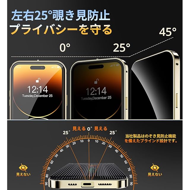 【覗き見防止とプライバシー保護】このiPhone14プロ ケースは、覗き見防止技術により、左右の視野からの視線を防ぎ、画面のプライバシーを守ります。このiPhone14 Pro ケースは、斜めから見るとブラインドルーバーにより画面が真っ黒になりますが、真正面から見ると高透過率ではっきり見ることが出来ます。画面内容は勿論、個人情報も完璧守られます。満員電車や会議室など、様々な場所で活躍し【プライバシーを守り】ます。公共の場で他人に画面を見られるのが嫌な方はぜひ使ってみて下さい!画面を使用したバーコード決済などは、画面を明るくしてご使用ください。