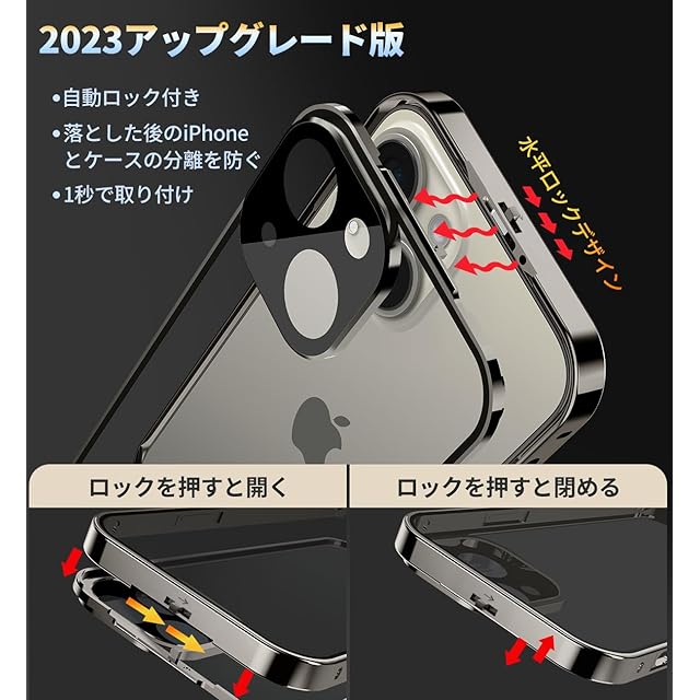 【ロック付きと一体型レンズ保護カバー】このアイフォン15ケースは上部にスライドボタン式のロックでケースの前後パーツをしっかり固定、万が一落下してもケースが分離せず、携帯がケースから飛び出す心配ないです。上部のボタンを押すだけで、ロックの解除も簡単、取り付けで開く非常に便利です。このスマホケース iphone 15に統合レンズ保護カバーは、レンズを完全にカバーして保護します。また、このレンズ保護カバーは擦り傷防止、塵などの侵入を防止します。レンズ保護カバーの形状はiPhoneのオリジナルデザインを損ねることなく、ボディと一体化しています。注意:このあいふぉん15ケースを使用するときは、画面に他のガラスフィルムを貼り付けないでください。タッチスクリーンの感度が非常に悪くなることがあります。(この製品を使用する際には、説明書を読んでからインストールすることを強くお勧めします。取り付けるとき、後カバーの下部の凸凹部分を確認してください。後カバーと前カバーの底部が位置合わせされ、ぴったりとフィットしていることを確認してください。)