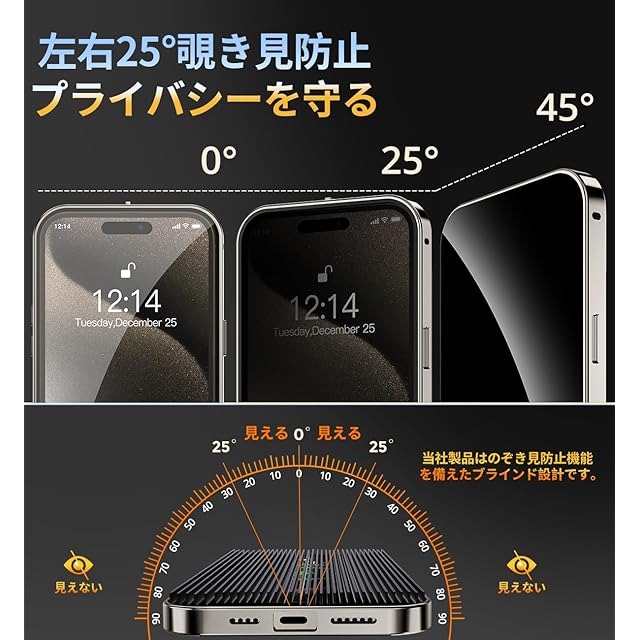 【覗き見防止とプライバシー保護】このiPhone15プロ ケースは、覗き見防止技術により、左右の視野からの視線を防ぎ、画面のプライバシーを守ります。このiPhone15 Pro ケースは、斜めから見るとブラインドルーバーにより画面が真っ黒になりますが、真正面から見ると高透過率ではっきり見ることが出来ます。画面内容は勿論、個人情報も完璧守られます。満員電車や会議室など、様々な場所で活躍し【プライバシーを守り】ます。公共の場で他人に画面を見られるのが嫌な方はぜひ使ってみて下さい!画面を使用したバーコード決済などは、画面を明るくしてご使用ください。