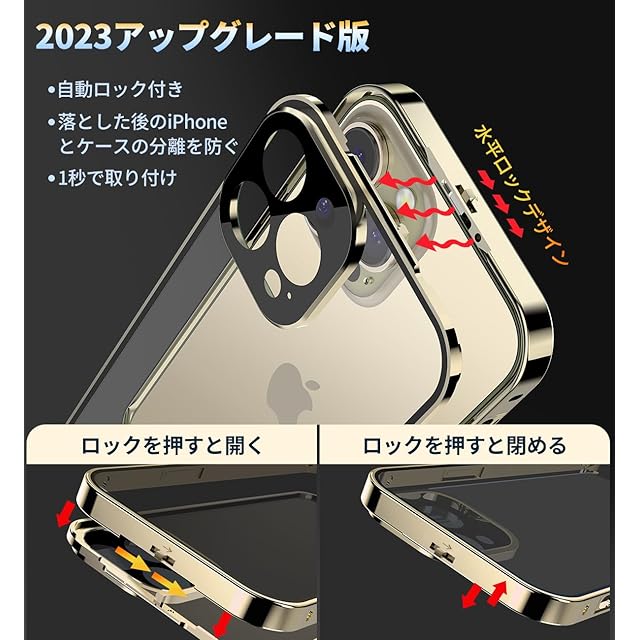 商品名:HGUTREY【覗き見防止・自動ポップアップボタン】 iPhone15 Pro 用 ケース 【ロック付き】【ストラップホール付き】一体型レンズ保護 両面9H強化ガラス iPhone15プロケース 耐衝撃 アルミ バンパー メタルフレーム スマホケース 薄型 背面クリア 高感度タッチ 軽量 すり傷防止 ワイヤレス充電対応 アイフォン15 Pro 用 カバー 6.1インチ(ゴールド)