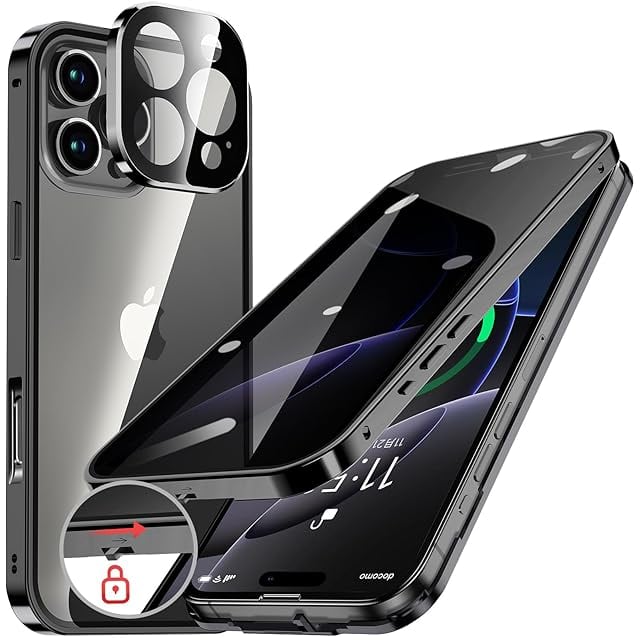 HGUTREY【覗き見防止・自動ポップアップボタン】 iPhone16 Pro Max 用 ケース 【ロック付き】【ストラップホール付き】一体型レンズ保護 両面9H強化ガラス iPhone16プロマックスケース 耐衝撃 アルミ バンパー メタルフレーム スマホケース 薄型 背面クリア 高感度タッチ 軽量 ワイヤレス充電対応 アイフォン16 Pro Max 用 カバー 6.9インチ(ブラック)