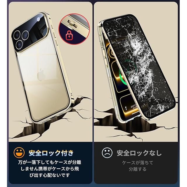 商品名:HGUTREY【覗き見防止・自動ポップアップボタン】 iPhone17 Pro Max 用 ケース 【ロック付き】【ストラップホール付き】一体型レンズ保護 両面9H強化ガラス iPhone17プロマックスケース 耐衝撃 アルミ バンパー メタルフレーム スマホケース 薄型 背面クリア 高感度タッチ 軽量 ワイヤレス充電対応 アイフォン17 Pro Max 用 カバー 6.9インチ(ゴールド)
