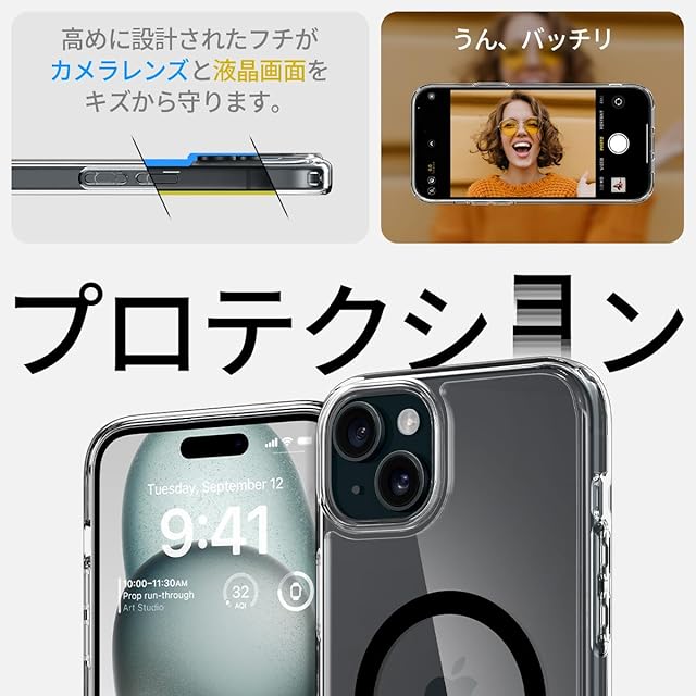 Spigen 【創業18年の技術力】 iPhone 15 ケース MagSafe クリア 耐衝撃 米軍MIL規格取得 ストラップホール 黄変抑制 透明 ストラップホール 2重構造 レンズ保護 擦り傷防止 MagSafe ワイヤレス充電対応 ウルトラ・ハイブリッド マグフィット ACS06803 (ブラック)