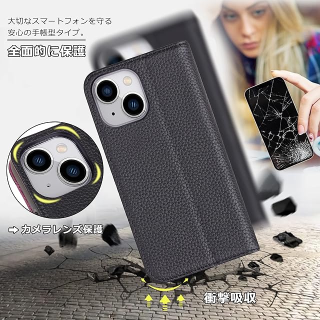 【収納機能、横置きスタンド機能】iPhone13ケース内側に実用性のカード入れポケット×4、内側ポケット×1、カード類、現金、名刺、免許証入れなどを収納でき、通勤も通学にも楽々タイプです。マグネットが内蔵されているので、ベルトがなくてもフタがぴったり閉まります。横置きスタンド機能が付きまして、好きな角度を調節できて、手放しでも動画視聴や読書に楽しめる。