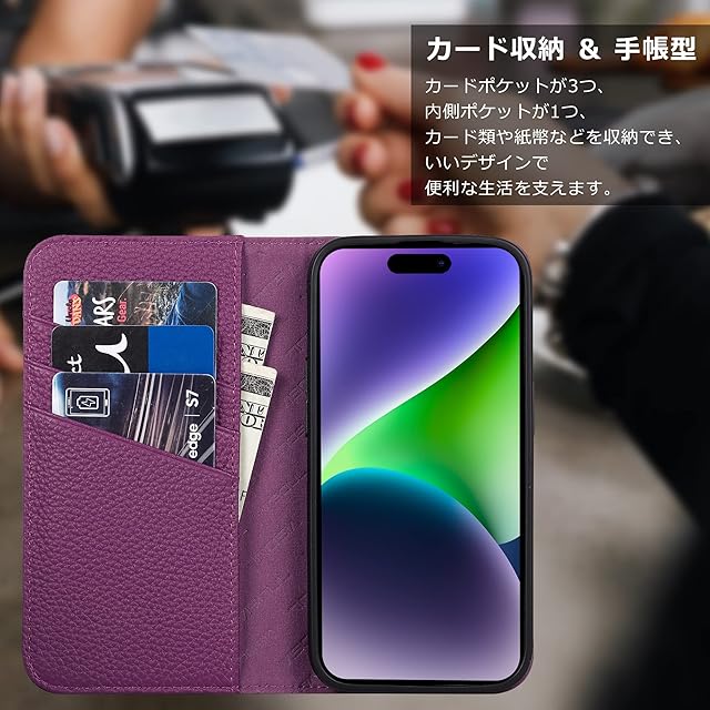 VISOUL iPhone13 Pro ケース 手帳型 本革 アイフォン13 プロ本革ケース レザー スマホケース iPhone 13 Pro 手帳ケース カード収納 携帯ケース 全面保護 マグネット 横置きスタンド iphone 13Pro 対応 6.1インチ シュリンクレザー iPhone 13 Pro パープル