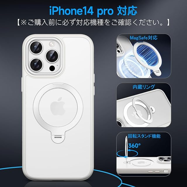 商品名:KISECASE iPhone 14 pro 用 ケース Magsafe対応 ワイヤレス充電 磁気リング マグネット搭載 定点360度回転スタンド ボタン保護 ホコリ防止 耐衝撃 耐久性 黄ばみ防 滑り止め 落下保護 傷防止 携帯ケース リング アイフォン14 pro 用 カバー ストラップホール付き (半透明+ホワイト, iPhone 14 Pro 用)
