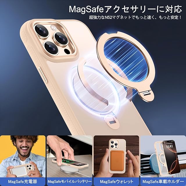 【MagSafe対応・磁力アップグレード】強力なN52マグネットが内蔵されて、瞬間でグッと吸い付いてしっかり固定し、ケースを装着したまま早速ワイヤレス充電を実現できます。 Mag Safeアクセサリーに対応します。ワイヤレス充電・モバイルバッテリー・車載ホルダー・ウォレットなどMagSafeデバイスと互換性があります。『ご注意:MagSafe ワイヤレス充電に対応しかなく、Qi ワイヤレス充電に適しません』