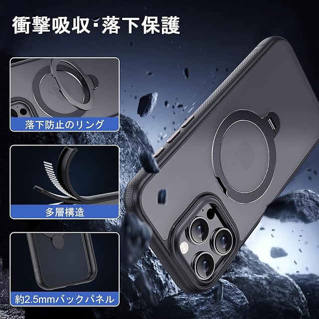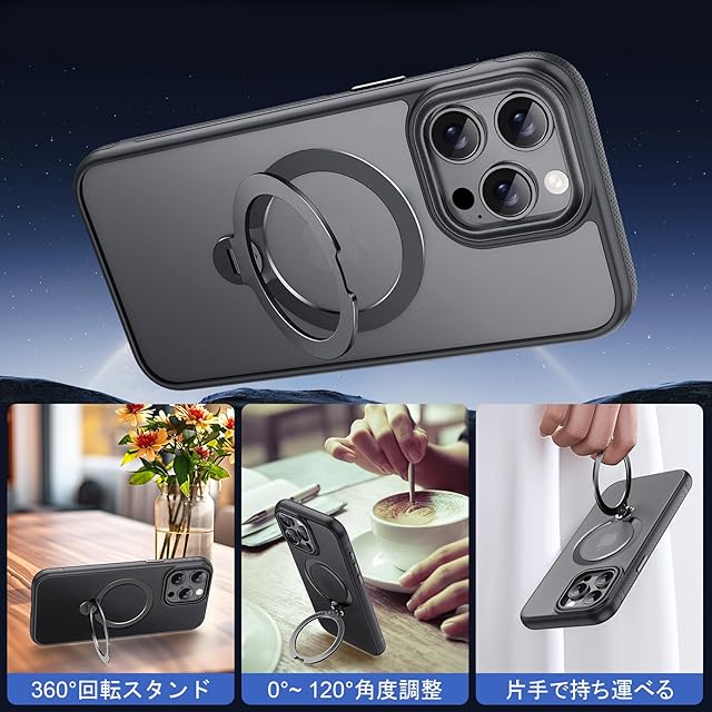 iPhone用 ケース MagSafe対応 ワイヤレス充電 磁気リング マグネット搭載 定点360度回転スタンド付き 耐衝撃 耐久性 保護ケース 黄ばみ防止 滑り止め 落下保護 傷防止 携帯ケース いphone対応カバー ストラップホール付き 指紋防止