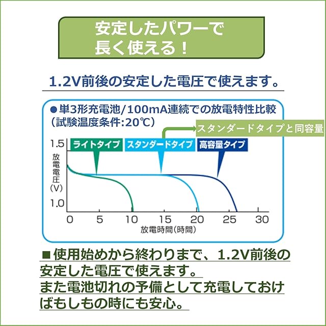 公称電圧(V):1.2V / 電池容量:min. 1,900mAh以上 :JIS C8708の充放電条件に基づく電池の容量