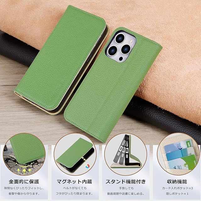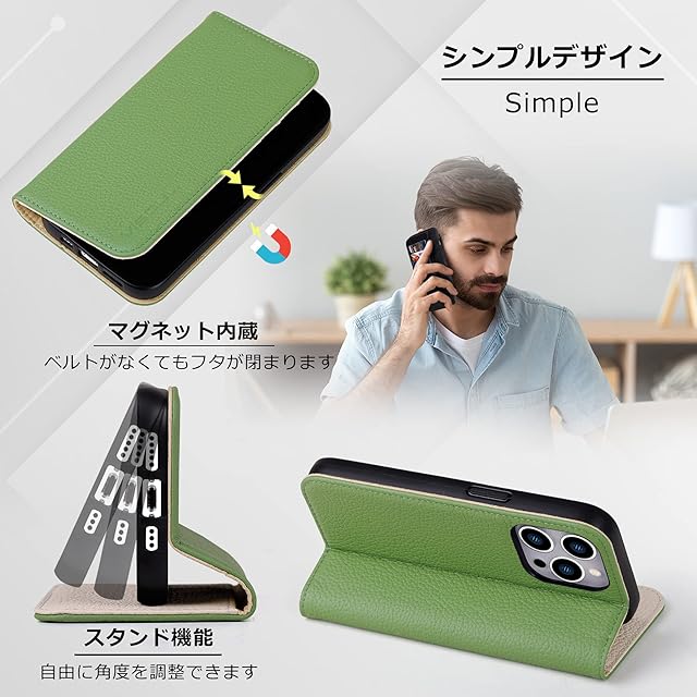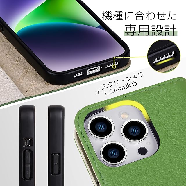 商品名:VISOUL iPhone 14 Pro ケース 手帳型 本革 レザー 衝撃吸収TPU素材 全面保護 マグネット式 カード収納 多機能 アイフォン14 Pro ケース 横置きスタンド機能付き手帳型ケース 2022年発売 アイホン14 Pro 対応 6.1インチ iphone 14 Pro グリーン ホワイト