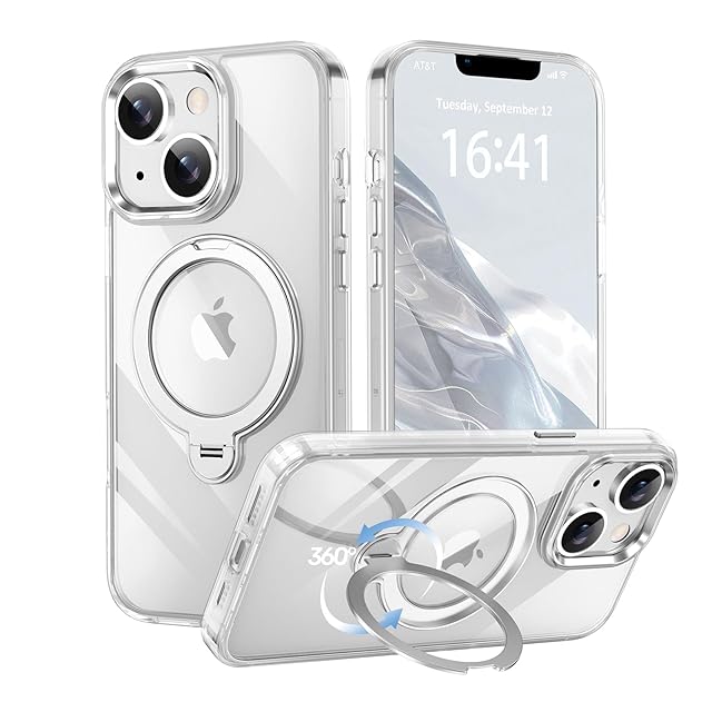 商品名:【透き通る上質感・多機能360°回転スタンド】KMAMBNG iPhone13 用 ケース Magsafe対応【耐衝撃・金属感・真空メッキ・黄変防止・ストラップホール付き】縦横両立 角度自在 調整可能 磁吸機能でワイヤレス充電対応 おしゃれ スマホケース (クリア, iPhone 13/14)
