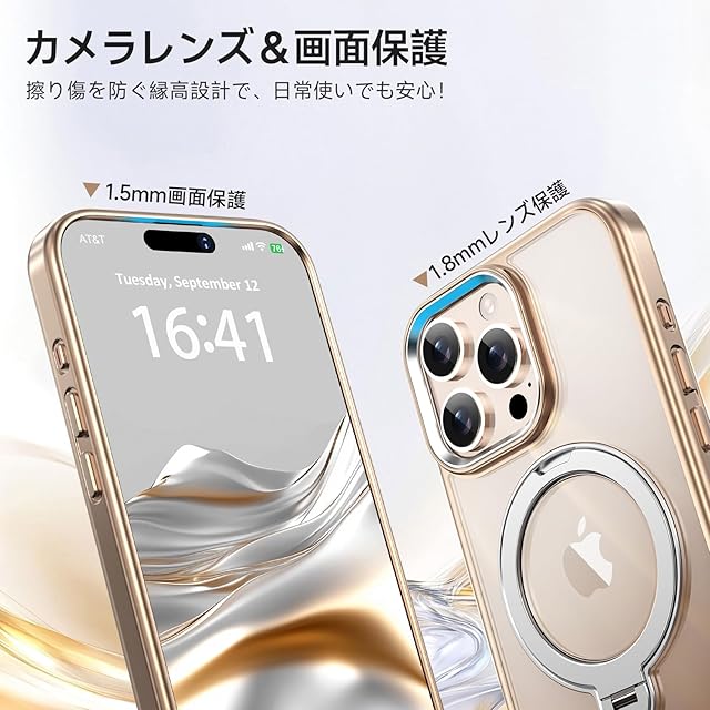 【最新!耐久性UP!360度回転スタンド】このiPhone 15 Pro 用 ケースには、最新の360度回転スタンドが搭載されており、縦横の角度を0°〜170°で自由に調整できます。市販のスタンドが横置きに対応できないという欠点を完全に解消しました!動画視聴やビデオ通話時に、最適な角度を簡単に設定でき、横置きの不便さを解消します。さらに、強力なベアリングを採用し、リング部分の耐久性が大幅に向上しました。最大10倍の耐久性を実現し、長期間使用することができます。片手で操作でき、便利さと耐久性を兼ね備えた優れたアイテムです。