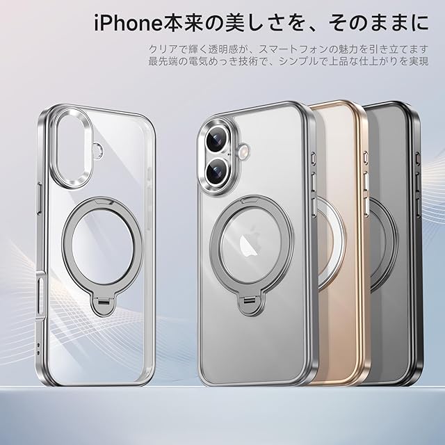 商品名:【透き通る上質感・多機能360°回転スタンド】KMAMBNG iPhone 16 用 ケース Magsafe対応【耐衝撃・金属感・真空メッキ・黄変防止・ストラップホール付き】縦横両立 角度自在 調整可能 磁吸機能でワイヤレス充電対応 おしゃれ スマホケース (グレー, iPhone 16)