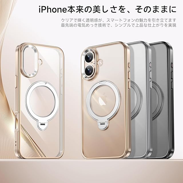 商品名:【透き通る上質感・多機能360°回転スタンド】KMAMBNG iPhone 16 用 ケース Magsafe対応【耐衝撃・金属感・真空メッキ・黄変防止・ストラップホール付き】縦横両立 角度自在 調整可能 磁吸機能でワイヤレス充電対応 おしゃれ スマホケース (ローズゴールド, iPhone 16)