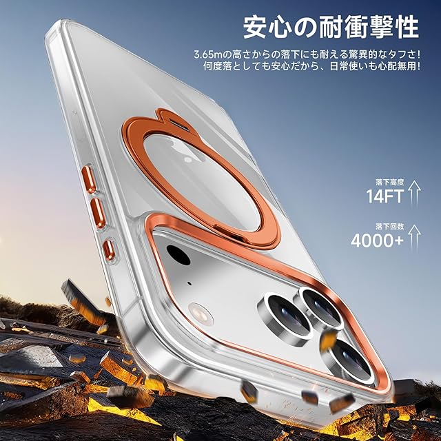 商品名:【透き通る上質感・多機能360°回転スタンド】KMAMBNG iPhone 17 ProMax 用 ケース Magsafe対応【耐衝撃・金属感・真空メッキ・黄変防止・ストラップホール付き】縦横両立 角度自在 調整可能 磁吸機能でワイヤレス充電対応 おしゃれ スマホケース(クリア&オレンジ,iPhone 17 Pro Max)