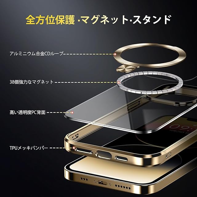商品名:【CD MagSafeリング・スタンド一体】iPhone12 Pro Max 用クリアケース[MagSafe対応・隠しスタンド] [本体の色・メッキバンパー]ストラップホール付き 角度調整可 米軍MIL規格取得・耐衝撃 アイホン12 Pro Max透明ケース スマホケース12プロマックス人気6.7インチ(ゴールド)