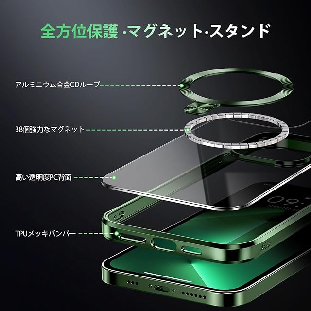 【CDパターン磁石リング・NEO永久磁石技術】 CD レコードの質感からインスピレーションを得たこのデザインはアルミニウム合金製で、iPhone 13 Pro MaxケースのMagsafe リングと統合されています。CDパターンの質感の金属光沢とシェルの電気メッキフレームは非常に高級感があり、あなたのiPhone 13 Pro Maxをユニークにします。このアイフォン 13 Pro Maxケースの隠しスタンド内部に「NEO永久磁石技術」配列永久磁石を使用し、iPhoneと同じタイプの輸入高コスト磁石コア、iPhone 13 Pro Max磁石充電により適しています。磁力は通常ケースの8倍以上!通常の磁石に比べ4~5倍のエネルギー変換があり、充電効率が大幅に向上します。このアイホン13 Pro Maxケースは全てのMagSafe対応アクセサリーに対応しているので、快適なスマホライフを共に過ごしましょう!