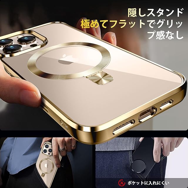 商品名:【CD MagSafeリング・スタンド一体】iPhone 16 Pro Max 用クリアケース[MagSafe対応・隠しスタンド] [本体の色・メッキバンパー]ストラップホール付き 角度調整可 米軍MIL規格取得・耐衝撃 アイホン16 Pro Max透明ケース スマホケース16プロマックス人気6.9インチ(ゴールド)
