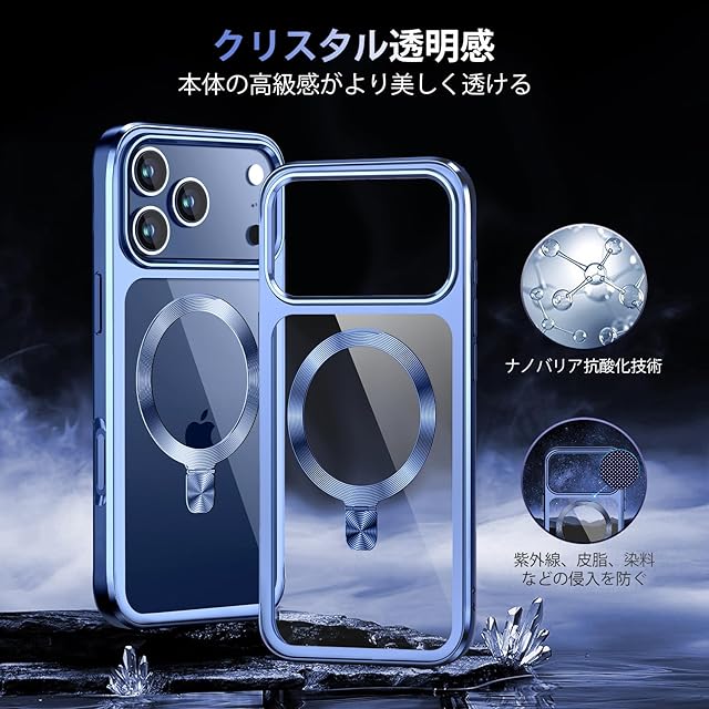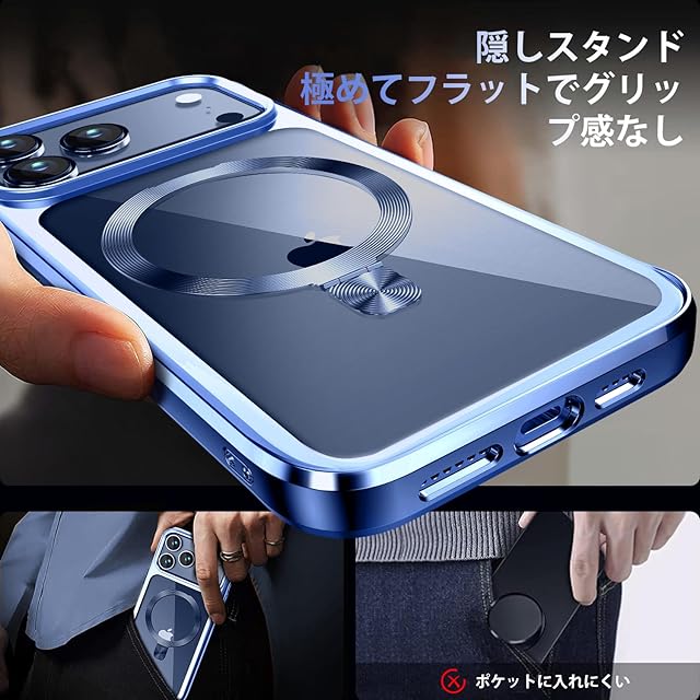 商品名:【CD MagSafeリング・スタンド一体】iPhone 17 Pro 用クリアケース[MagSafe対応・隠しスタンド] [本体の色・メッキバンパー]ストラップホール付き 角度調整可 米軍MIL規格取得・耐衝撃 アイホン17 Pro透明ケース スマホケース17プロ人気6.3インチ(ブルー)