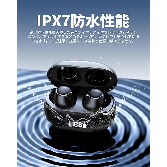 【IPX7防水性能】IPX7 防水防汗。高い防水性能を実現した完全ワイヤレスイヤホンは、ジムやランニング、フィットネスなどのスポーツ中、雨の日でも安心して使用できます。 ※ご注意:充電ケースは防水仕様ではありません。