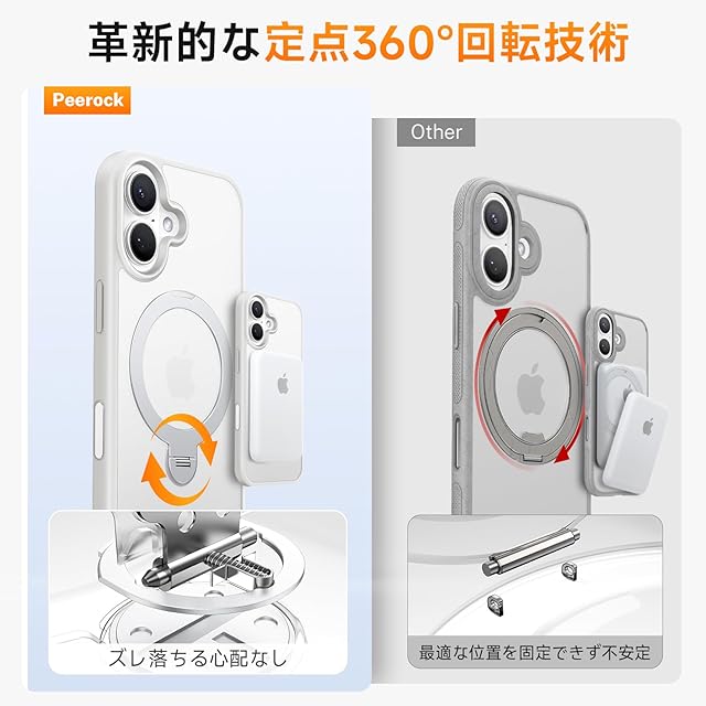 【2025革新登場・360°回転スタンド】Peerock iPhone 17 用ケース MagSafe対応 縦横両対応 角度自由調整 カメラコントロールボタン 米軍MIL規格 精密カメラ保護 耐衝撃 高耐久性 フィット感 ワイヤレス充電対応 半透明マット 指紋防止 強力磁力 いphone17 用ケース 6.3インチ(ホワイト)