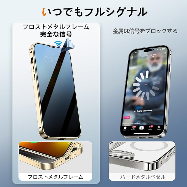 商品名:【スライドカバー磁気ロック・覗き見防止・新次元の一体型カメラ保護 +CD隠しスタンド】iPhone 13 Pro Max 用 ケース 全面保護 Magsafe対応 ランヤードホール付き [本体を再現・マット金属フレーム ] 縦横両対応 9H強化ガラス ワイヤレス充電対応 クリア 両面スマホケース 高感度タッチ いphone13Pro Max 用 ケース 6.7インチ (ゴールド)