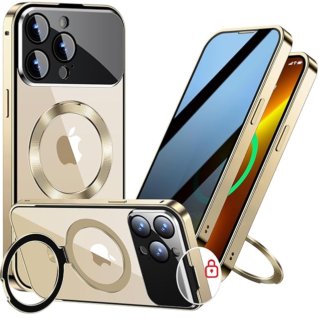 【スライドカバー磁気ロック・覗き見防止・新次元の一体型カメラ保護 +CD隠しスタンド】MESTRIEV iPhone 13 Pro 用 ケース 全面保護 Magsafe対応 ランヤードホール付き [本体を再現・マット金属フレーム ] 縦横両対応 9H強化ガラス ワイヤレス充電対応 クリア 両面スマホケース タッチ感度抜群 いphone13Pro 用 ケース 6.1インチ (ゴールド)