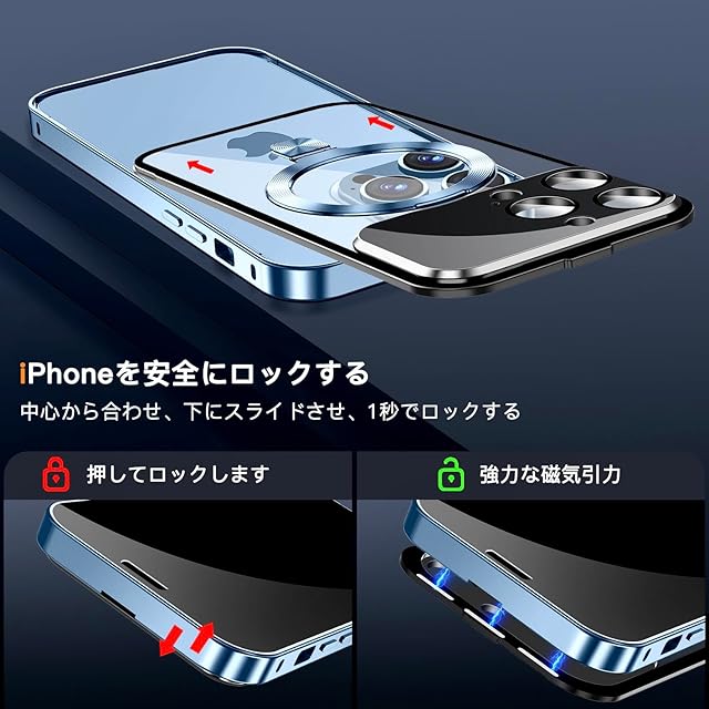 【スライドカバー磁気ロック・新次元の一体型カメラ保護】このiPhone 13 Pro ケースは、革新的なデザインと優れた機能性を兼ね備え、スマホの保護において新しい次元を提供します、日常的な使用に最適です。スマホの上部には強力な磁気ロックが搭載されており、あなたのiPhone 13 Pro をしっかりと固定し、落下や衝撃から守ります。これにより、スマホを使う際の安定感と安心感が大幅に向上します。また、このiphone13 プロケースは、ロックと解除が簡単にでき、スマホの操作性を高めます。スライドと引き出しで1秒以内にロック/アンロックが可能。さらに、新次元の一体型カメラ保護は、このケースのもう一つの素晴らしい特徴です。カメラ部分を完全にカバーするこの一体式設計は、従来のカメラ保護に比べて、さらに進化した保護機能を提供します。従来のカメラ保護膜にありがちな隙間や不安定さを一切感じさせません。このアイフォン 13 Pro ケースのレンズフィルムは、AR技術を採用し、さらに8k超透明液晶ディスプレイ技術を採用した。100%透過率で、色を忠実に再現