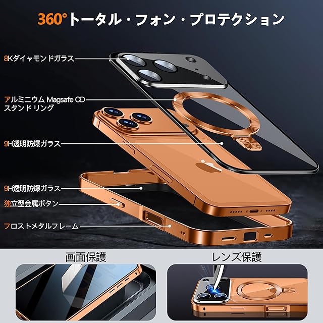 商品名:【スライドカバー磁気ロック・覗き見防止・新次元の一体型カメラ保護 +CD隠しスタンド】iPhone 17 Pro Max 用 ケース 全面保護 Magsafe対応 ランヤードホール付き [本体を再現・マット金属フレーム ] 縦横両対応 9H強化ガラス ワイヤレス充電対応 クリア 両面スマホケース 高感度タッチ いphone17 Pro Max 用 ケース 6.9インチ(オレンジ色)