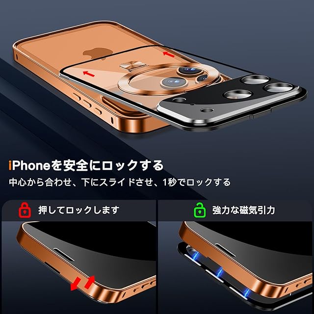 商品名:【スライドカバー磁気ロック・覗き見防止・新次元の一体型カメラ保護 +CD隠しスタンド】MESTRIEV iPhone 17 Pro 用 ケース 全面保護 Magsafe対応 ランヤードホール付き [本体を再現・マット金属フレーム ] 縦横両対応 9H強化ガラス ワイヤレス充電対応 クリア 両面スマホケース 高感度タッチ いphone17 Pro 用 ケース 6.3インチ (オレンジ色)