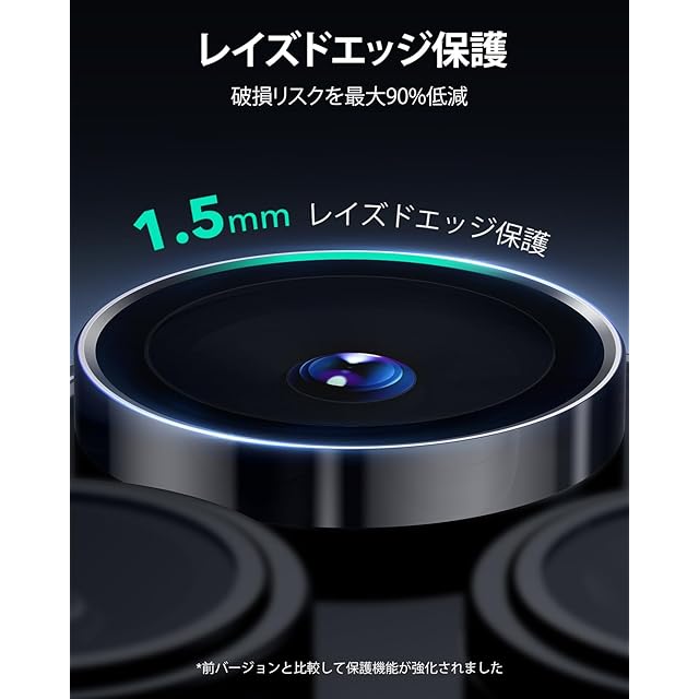 【50kg耐衝撃の強度!大切なカメラを守る】超薄型設計、厚さたった0.33 mmなので、スマートフォンのカラーを邪魔しません。4層コーティングを施した精巧なフィルムは、フィルムの周囲のエッジが中央より盛り上がった「凹型」デザインを採用しています。この凹型エッジデザインは、従来のデザインに比べて優れた保護性能を発揮し、最大50kgの耐衝撃性を備え、どんなに強い衝撃や傷からもレンズを守ります