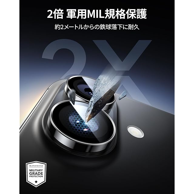 【新構造で衝撃に強く!割れにくさが80%向上】このiPhone 17/iPhone 16/iPhone 16 Plus専用レンズプロテクターは、全新しい「凹」型構造を採用、衝撃を効果的に分散し、割れる確率を80%も低減します。米軍MIL規格認証(MIL-STD-810H 516.8)の耐衝撃性能で、大切なカメラレンズをプロ級にガードします。耐落下性能は前モデル比2倍の進化です!