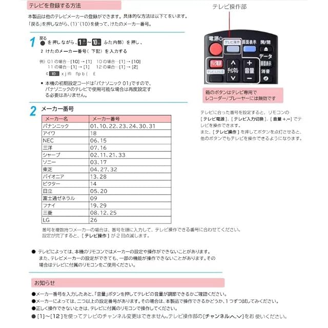 【適用機種】このパナソニック ディーガ リモコン Panasonic ブルーレイプレーヤー panasonic ir6 リモコン プレーヤー N2QAYB001071 DMR-BRG2020 DMR-BRZ1020 DMR-BRW1020 DMR-BRW520対応 (注:レコーダー/プレーヤーの音量は、テレビの音量を調整することでコントロールされるため、リモコンの音量ボタンを直接押しても、お使いのテレビに対応するメーカー番号を設定しない限り効果はありません)。