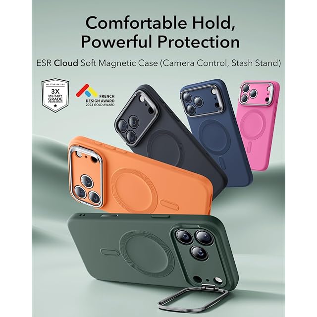 【デザイン受賞シリーズ!】ESR iPhone 17 Pro Max ケース MagSafe対応 カメラボタン付き 隠しスタンド 調整可能 3倍米軍MIL規格 ワイヤレス充電対応 エアガードコーナー 耐衝撃 傷防止 軽量 スマホケース 高級柔らかな素材 雲のような肌触り いphone17promaxケース アイフォン17プロマックス専用Cloudシリーズ(グリーン)