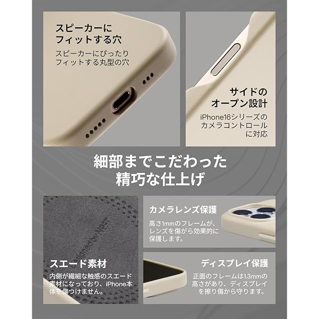 【細部まで確実に保護】iPhone 16に設計されたカメラレンズ保護は、高さ1mmのフレームがあり、レンズを傷から効果的に保護します。 ケースの内側には繊細な触感のスエード素材を採用し、iPhone本体に傷がつくのを防ぎます。正面のフレームは1.3mmの高さがあり、ディスプレイを擦り傷から守ります。スピーカー部分にフィットする丸い穴は、iPhone 16 のスピーカーにぴったり合うように繊細に設計されており、外観の美しさをより高めるだけでなく、音質保護も向上させます。