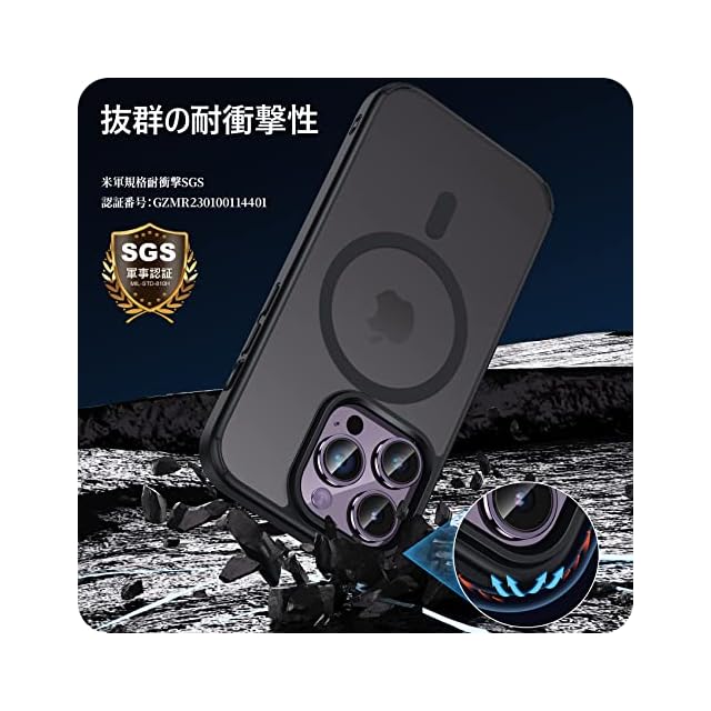 【対応機種】iPhone14pro 用(6.1インチ・三眼レフ)【米国MIL規格取得・超高耐衝撃性】世界で有名な米国防総省が規定する米軍採用品規格「MIL-STD-810H」に準拠。(認証番号:GZMR230100114401)。1.22mの高さからコンクリートの地面に厚さ5mmの合板を敷いた上に合計26回それぞれ違う角度から落下させて、本体は完全に無事です。高い耐衝撃性を誇り、iPhone 14 proを全方位からしっかりと守ります。