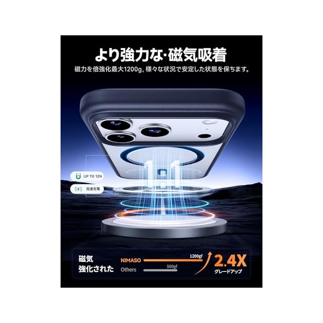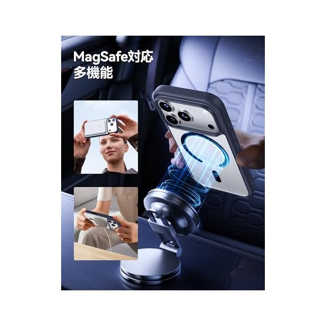 【強力な磁力吸着・高速充電】強力なマグネットが内蔵されており、差し込みのいらない超簡単充電を実現。マグネット部分は位置が正確に合致しており、ワイヤレス充電がこれまでよりもすばやく簡単に完了します。あいふぉん17 Proを充電する時は、ケースを装着したままMagSafe充電器に取り付けるか、Qi規格の充電器の上に置くだけです。