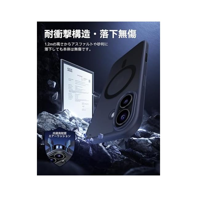 【米軍規格SGS認証・超強耐衝撃性】世界で有名な米国防総省が規定する米軍採用品規格「MIL-STD-810H」認証を取得済み(認証番号:GZMR220802602301)。ケースの縁はiPhoneの液晶画面より1mm、カメラレンズより1.2mm高く、ガラスフィルムを貼り付けた状態で平置きしても画面は接触せず保護をします。コンクリート地面に厚さ5mmの合板を敷き、高さ1.2mから合計26回、様々な角度から落下させる実験をしたところ、本体に傷はつきませんでした。高い耐衝撃性を誇り、本体を全方位からしっかりと守ります。