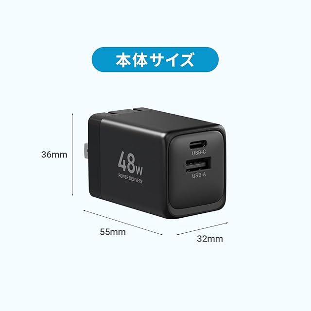 【商品仕様】◇本体サイズ:幅5.5×奥行3.2×高さ3.6cm ◇本体重量:80g ◇出力:USB-C/USB-A◇合計出力:USB-C(45W)/USB-A(18W),2ポート同時使用(48W(USB-C:30W+USB-A:18W)) ◇期間:お買い上げ日より1年間(の範囲については、取扱説明書をご確認ください。(書の記載内容と異なる使い方や目的で使用されますとの対象外となります。また生じた損害についても弊社は一切責任を負いません。)