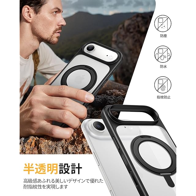 商品名:NIMASO iPhone Air 用 ケース 縦横両対応 360°回転スタンドケース いphone air 用 MagSafeアクセサリー対応 カメラコントロールカバー 携帯スマホケース リングマグネット ワイヤレス充電対応 半透明 防指紋 米軍MIL規格 耐衝撃性 ストラップホール付き アイフォン エアー用 アジャスタブルスタンド ブラック(黒羽シリーズ)NSC25F1666