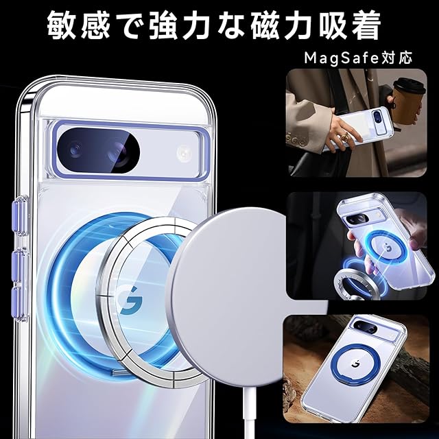商品名:【米軍MIL規格・Magsafe対応】Google Pixel 8A 用 ケース MagSafe対応 リング 360°回転スタンド機能 縦横両対応 透明 黄ばみ防止 ワイヤレス充電 レンズ保護 耐衝撃 携帯カバー グーグルピクセル8A カバー 6.1 インチ マグネット搭載 車載ホルダー マグセーフ対応 おしゃれ (クリアブルー)