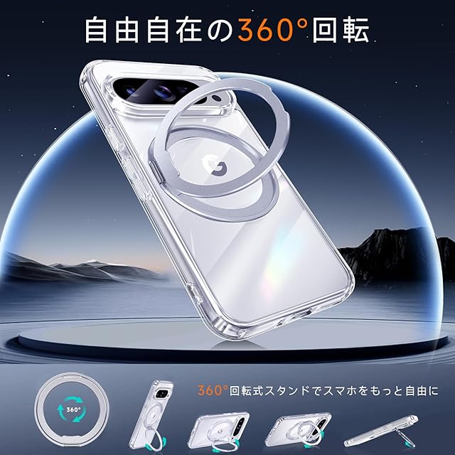 商品名:【米軍MIL規格・Magsafe対応】Google Pixel 9 Pro XL 用 ケース MagSafe対応 リング360°回転スタンド機能 縦横両対応 透明 黄ばみ防止 ワイヤレス充電 レンズ保護 耐衝撃 携帯カバー 6.8 インチ マグネット搭載 車載ホルダー マグセーフ対応 おしゃれ (クリア)