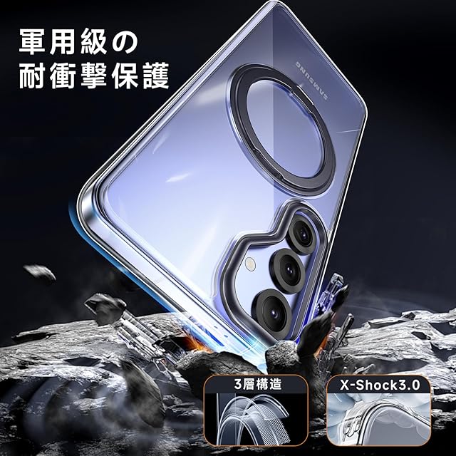 商品名:【米軍MIL規格・Magsafe対応】Galaxy S25 用 ケース MagSafe対応 リング 360°回転スタンド機能 縦横両対応 透明 黄ばみ防止 ワイヤレス充電 レンズ保護 耐衝撃 携帯カバー ギャラクシー S25 カバー マグネット搭載 車載ホルダー マグセーフ対応 おしゃれ (クリアブラック)